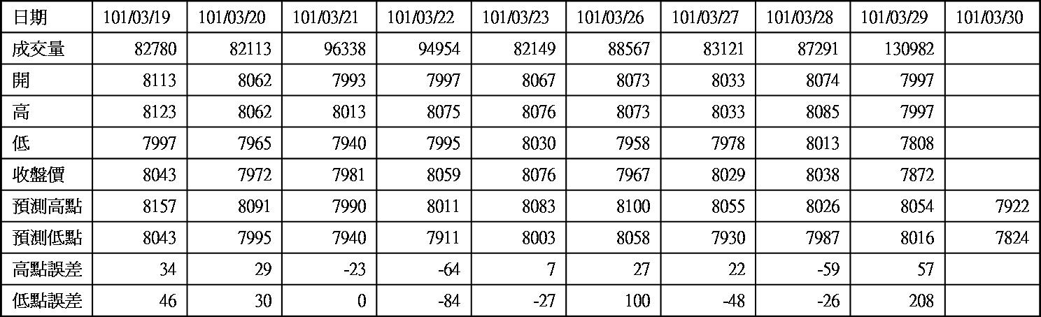 高低點震盪預測+/-誤差大於75點或與前日變化大表示進入盤整或新趨勢