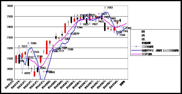 長線看法中空轉長空 外資現貨賣超約12.8億 期貨未平倉量多單水位急降至7100多口 大盤今日反彈後走低收黑 中線盤頭危機未解 目前對後勢空頭的看法不變 手中多空對鎖單續抱 藍色虛線為指標 藍色實線為指標的移動平均線(週期2) 粉色實線為5(日,週,月)平均線 目前週線站上指標和5週均線 月線站上指標和5月均線 日線站上指標和5日均線 大盤日線 大盤週線 大盤月線 台股期貨未平倉 台指選擇權未平倉 三大法人現貨買賣超 大盤高低點振盪預測 高低點振盪預測+/-誤差大於75點或與前日變化大表示進入盤整或新趨勢