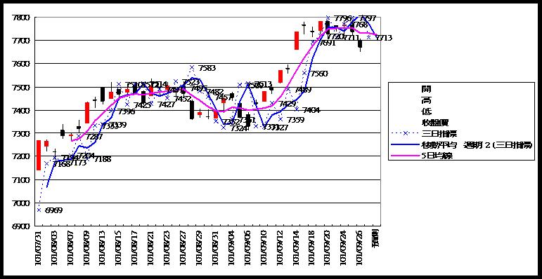 長線看法中空轉長空 外資現貨轉為超約31.2億 期貨未平倉量多單水位微降至5200多口 大盤今日開低走低收低 明天星期四摩台結算 頭部島狀反轉成型 後勢不樂觀 盤中空11月小指1口 其餘多空對鎖單續抱 藍色虛線為指標 藍色實線為指標的移動平均線(週期2) 粉色實線為5(日,週,月)平均線 目前週線站上指標和5週均線 月線站上指標和5月均線 日線跌破指標和5日均線 大盤日線 大盤週線 大盤月線 台股期貨未平倉 台指選擇權未平倉 三大法人現貨買賣超 大盤高低點振盪預測 高低點振盪預測+/-誤差大於75點或與前日變化大表示進入盤整或新趨勢 期貨庫存
