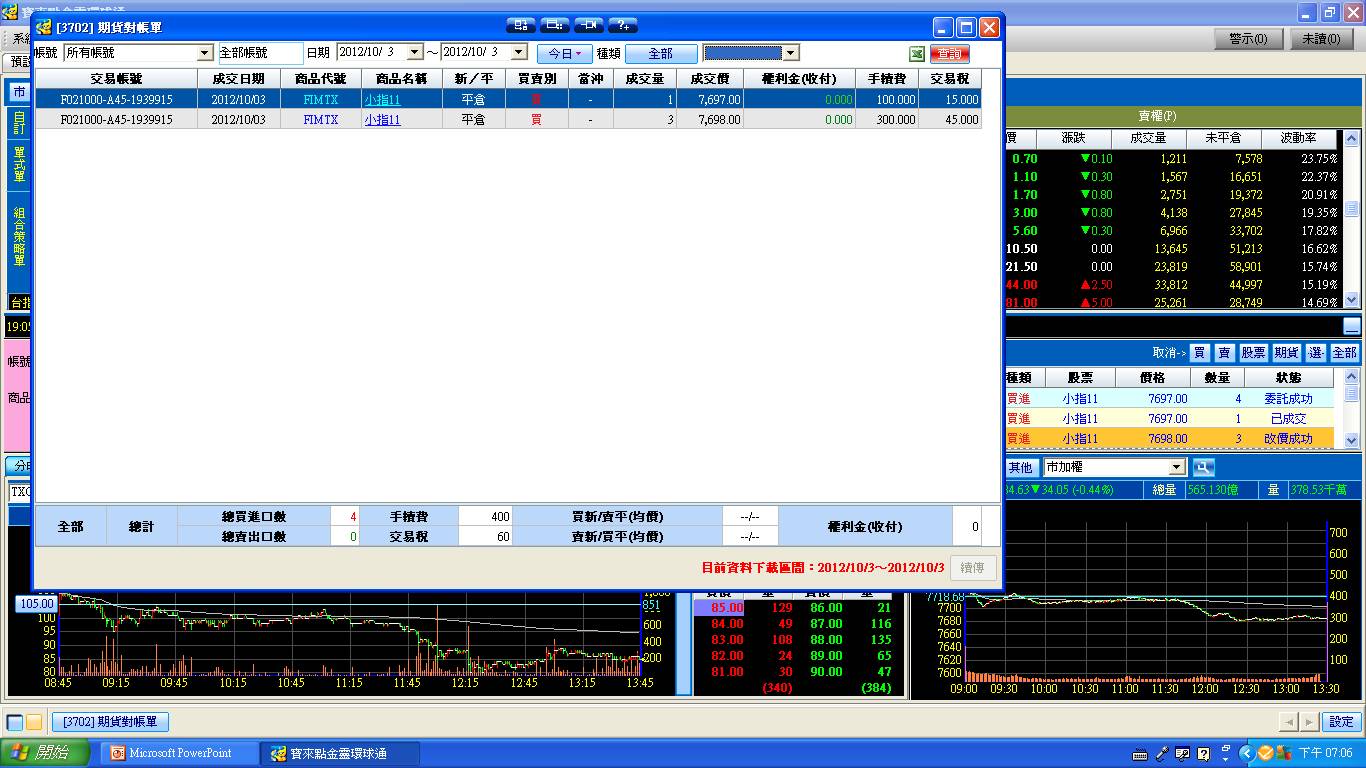 長線看法中空轉長空 外資現貨買超約15億 期貨未平倉量多單水位下降至4000多口 大盤今日開小高振盪走低收低 量能依舊疲弱 盤整待變 尾盤平倉手中所有11月小指空單 因家中急用現金 無關看法和佈局 其餘多空對鎖單續抱 藍色虛線為指標 藍色實線為指標的移動平均線(週期2) 粉色實線為5(日,週,月)平均線 目前週線跌破指標但站上5週均線 月線站上指標和5月均線 日線跌破指標和5日均線 大盤日線 大盤週線 大盤月線 台股期貨未平倉 台指選擇權未平倉 三大法人現貨買賣超 大盤高低點振盪預測 高低點振盪預測+/-誤差大於75點或與前日變化大表示進入盤整或新趨勢 期貨對帳單