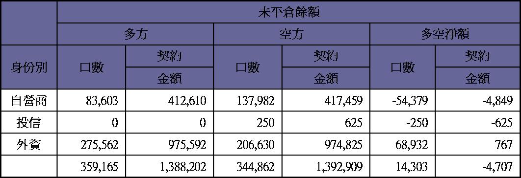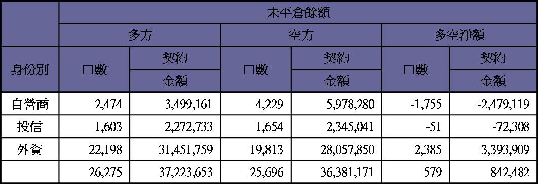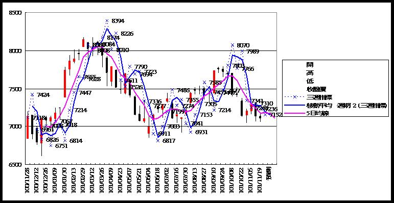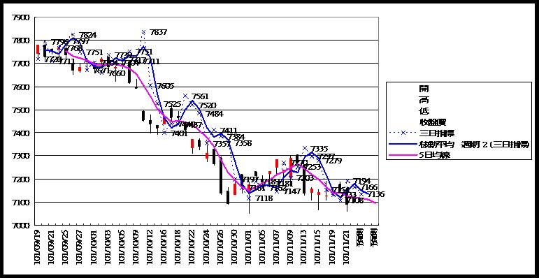長線看法中空轉長空 外資現貨轉買超約14.5億 期貨未平倉量空單水位轉為多單2300多口 大盤今日開高振盪走低 外資今日期貨轉空為多 是否真的轉多或單純避險仍須觀察 目前多空僵持 量縮多空都使不上力 手中剩餘空單續抱 藍色虛線為指標 藍色實線為指標的移動平均線(週期2) 粉色實線為5(日,週,月)平均線 目前週線跌破指標和5週均線 月線跌破指標和5月均線 日線跌破指標和5日均線 大盤日線 大盤週線 大盤月線 台股期貨未平倉 台指選擇權未平倉 三大法人現貨買賣超 大盤高低點振盪預測 高低點振盪預測+/-誤差大於75點或與前日變化大表示進入盤整或新趨勢