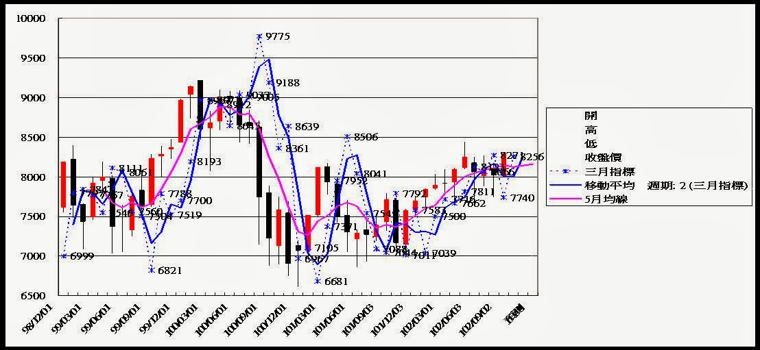 長線看法中空轉長空 外資現貨買超約56.8億 期貨未平倉量多單水位降為約4400口 今日大盤開盤後在平盤附近振盪 盤中一度下殺 但隨即拉回平盤附近繼續振盪至收盤 成交量維持800多億附近 藍色虛線為指標 藍色實線為指標的移動平均線(週期2) 粉色實線為5(日,週,月)平均線 目前週線站上指標和5週均線 月線站上指標和5月均線 日線站上指標和5日均線 大盤日線 大盤週線 大盤月線 台股期貨未平倉 台指選擇權未平倉 三大法人現貨買賣超 大盤高低點振盪預測 高低點振盪預測+/-誤差大於75點或與前日變化大表示進入盤整或新趨勢