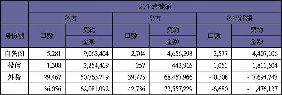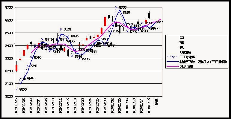 長線看法中空轉長空 外資現貨買超約47.2億 期貨未平倉量空單水位增為約10300多口 今天大盤開高過高後走低壓回平盤附近 成交量縮回1000多億附近 藍色虛線為指標 藍色實線為指標的移動平均線(週期2) 粉色實線為5(日,週,月)平均線 目前週線站上指標和5週均線 月線站上指標和5月均線 日線站上指標和5日均線 大盤日線 大盤週線 大盤月線 台股期貨未平倉 台指選擇權未平倉 三大法人現貨買賣超 大盤高低點振盪預測 高低點振盪預測+/-誤差大於75點或與前日變化大表示進入盤整或新趨勢