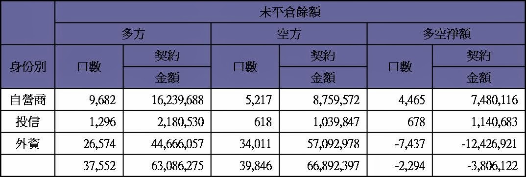 長線看法中空轉長空 外資現貨賣超約2.23億 期貨未平倉量空單水位減為約7400多口 今天大盤開高走高 成交量維持在近800億附近 藍色虛線為指標 藍色實線為指標的移動平均線(週期2) 粉色實線為5(日,週,月)平均線 目前週線跌破指標和5週均線 月線跌破指標和5月均線 日線站上指標和5日均線 大盤日線 大盤週線 大盤月線 台股期貨未平倉 台指選擇權未平倉 三大法人現貨買賣超 大盤高低點振盪預測 高低點振盪預測+/-誤差大於75點或與前日變化大表示進入盤整或新趨勢