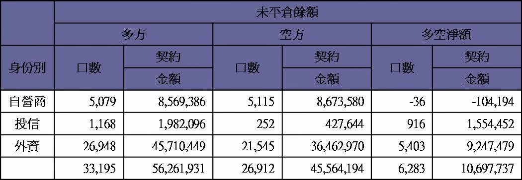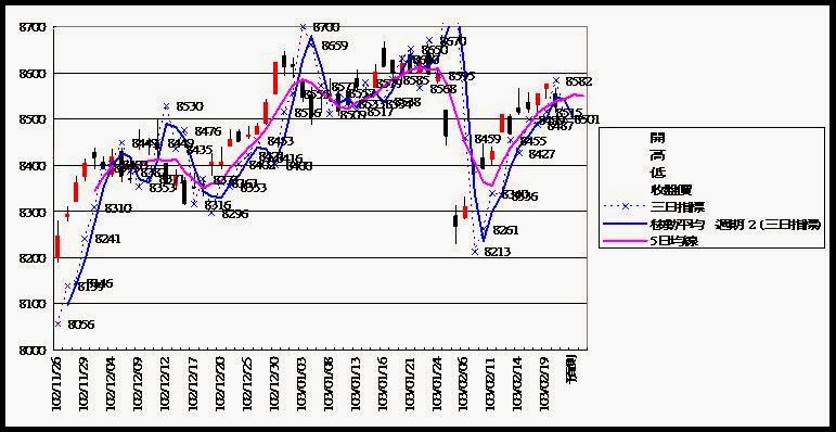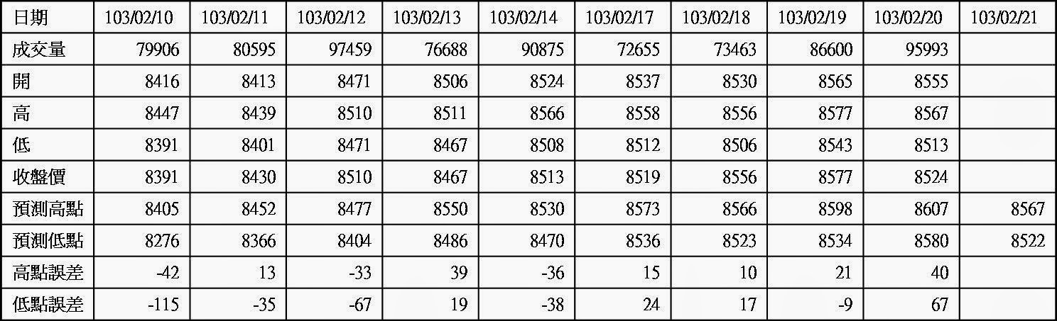 長線看法中空轉長空 外資現貨買超約9.9億 期貨未平倉量多單水位減為約5400多口 今天大盤開低後早盤略有振盪 接著一路走低至收盤 成交量增至900多億附近 藍色虛線為指標 藍色實線為指標的移動平均線(週期2) 粉色實線為5(日,週,月)平均線 目前週線站上指標和5週均線 月線站上指標和5月均線 日線跌破指標和5日均線 大盤日線 大盤週線 大盤月線 台股期貨未平倉 台指選擇權未平倉 三大法人現貨買賣超 大盤高低點振盪預測 高低點振盪預測+/-誤差大於75點或與前日變化大表示進入盤整或新趨勢